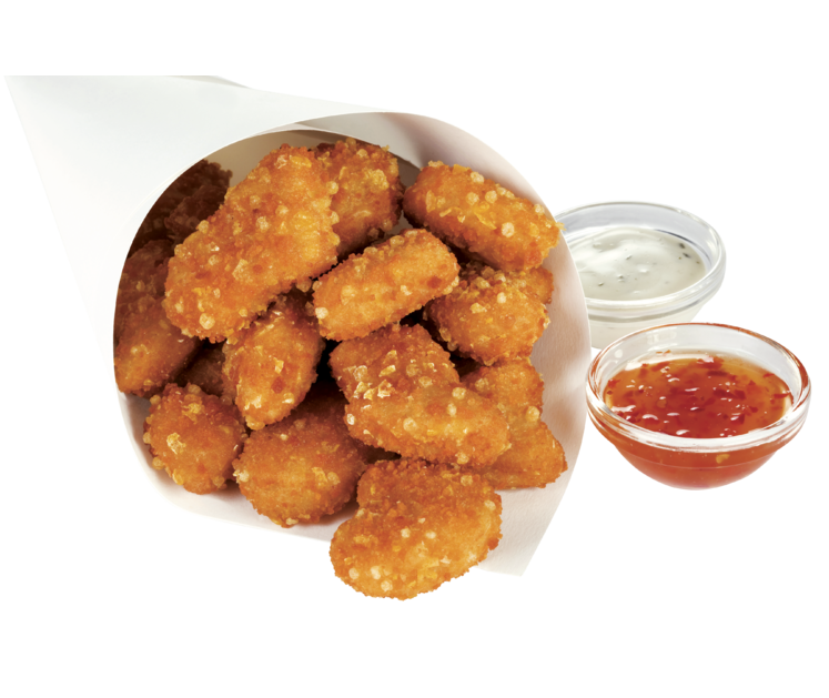 kylling & kalkunkjøtt 48 % , vann, mais, rismel, stivelse, maismel,rapsolje, salt, hvetefiber, sukker, stabilisator E451 og E450, krydder.