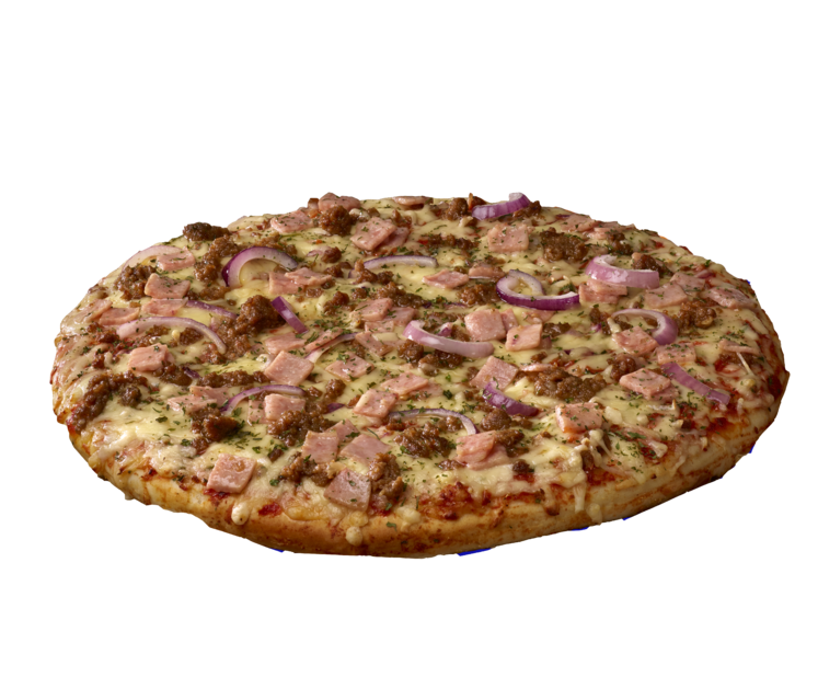 HVETEMEL, vann, OST 16 % (edamer), tomatpuré, 5 % skinkesammensatt av stykker av kjøtt (svinekjøtt, vann, salt, stabilisator(E450, E451), konserveringsmiddel (E250), røykaroma, antioksidant(E301), rosmarineekstrakt)), krydret kjøttdeig 5 % (storfekjøtt, vann,løk, salt, potetstivelse, sukker, krydder, stabilisator (E450, E451),antioksidant (E301)), rødløk, rapsolje, maismel, salt, maltetHVETEMEL, gjær, sukker, krydder, hevemiddel (E450, E500, E341),løk. Kan inneholde SOYA