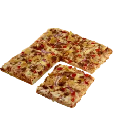 Firkantpizza Taco er ferdigtoppet pizza med tomatsaus, ost, taco kjøttdeig, løk, rød paprika og toppet med nacho chips.
